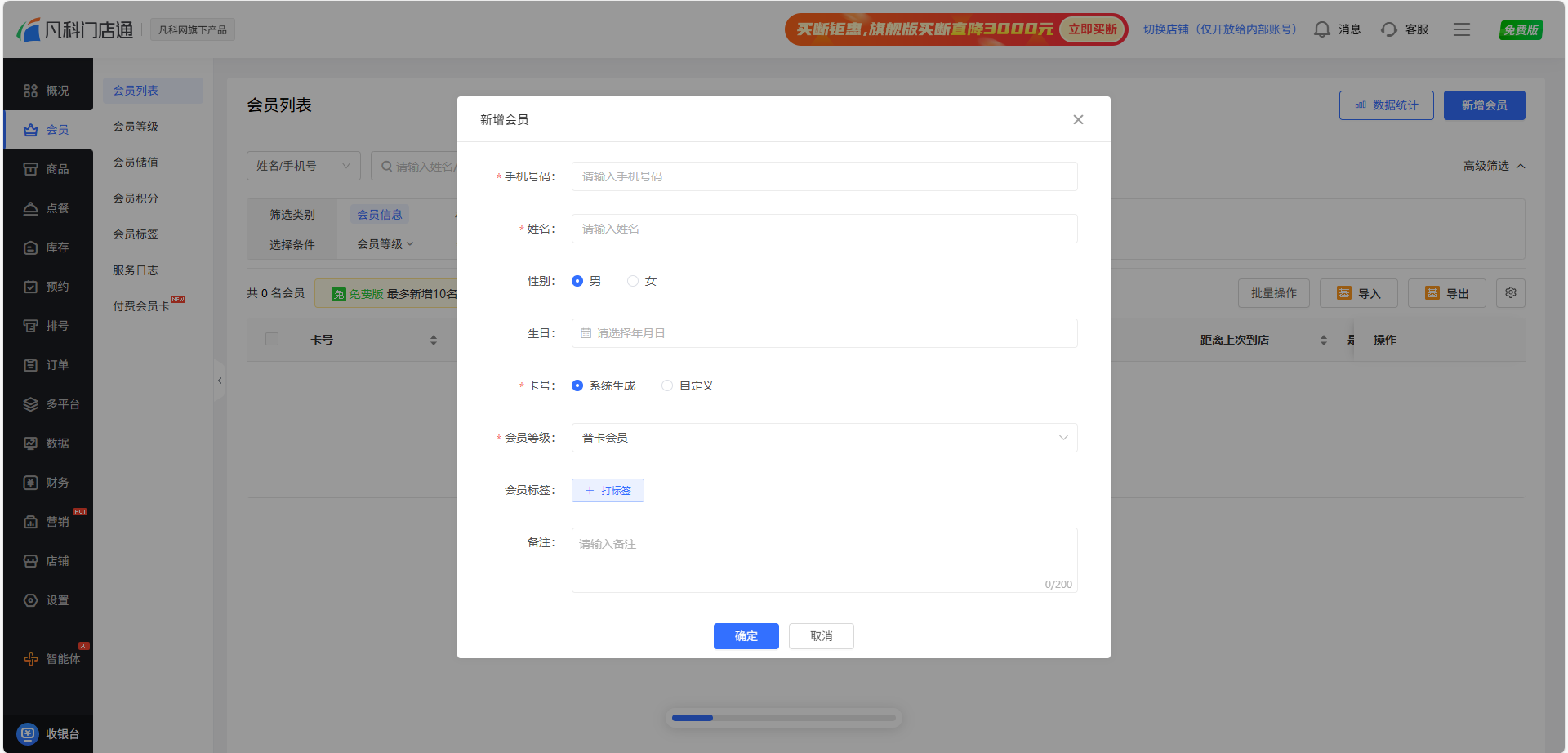 裝修完我們的店鋪之后呢,我們點(diǎn)擊“會(huì)員”這個(gè)版塊,點(diǎn)擊“新增會(huì)員”,輸入會(huì)員的手機(jī)號碼、姓名、卡號、會(huì)員等級等基本信息,會(huì)員就添加完成啦!