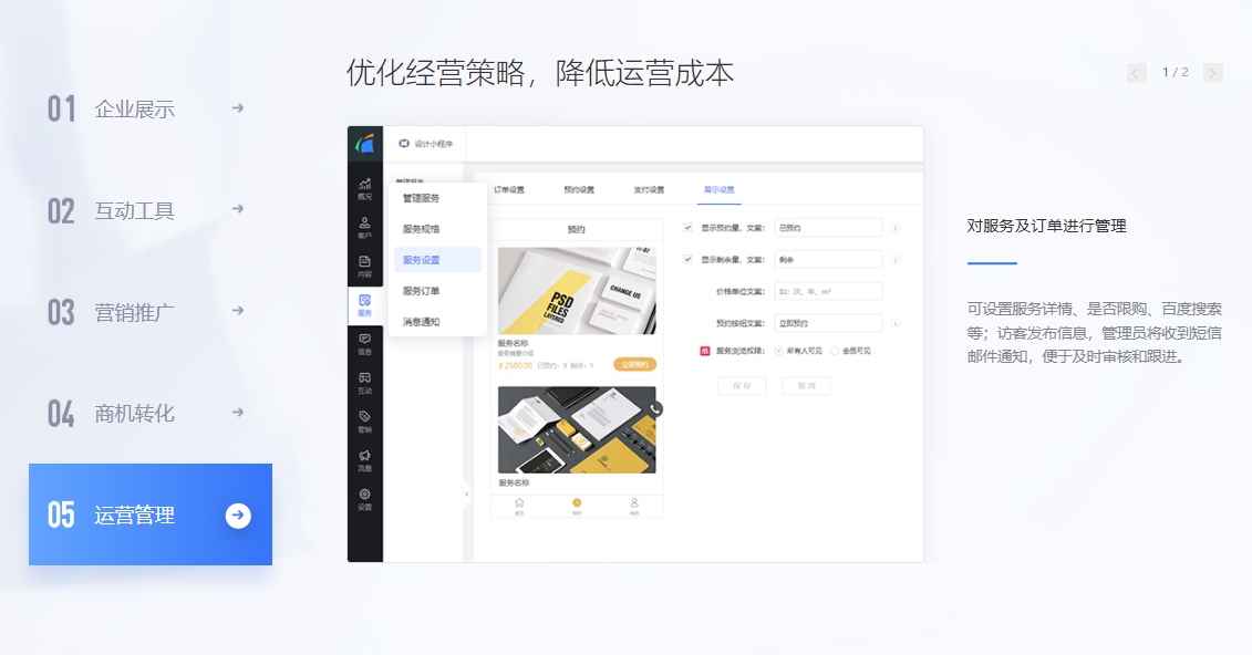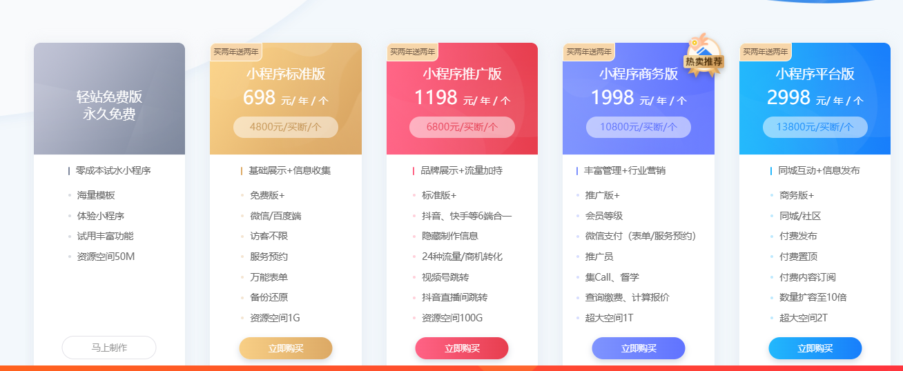 小程序標準版價格低至698元/年/個,支持微信和百度兩個終端,提供服務預約、表單等功能;小程序推廣版1198元/年/個,支持抖音、快手等6端合一,具有隱藏制作信息、視頻號跳轉(zhuǎn)、抖音直播間跳轉(zhuǎn)等功能;而小程序商務版1998元/年/個,提供1T的超大空間,具有推廣員、查詢繳費、計算報價等多種功能;小程序平臺版2998元/年/個,支持同城互動+信息發(fā)布,數(shù)量擴容至10倍,功能豐富。