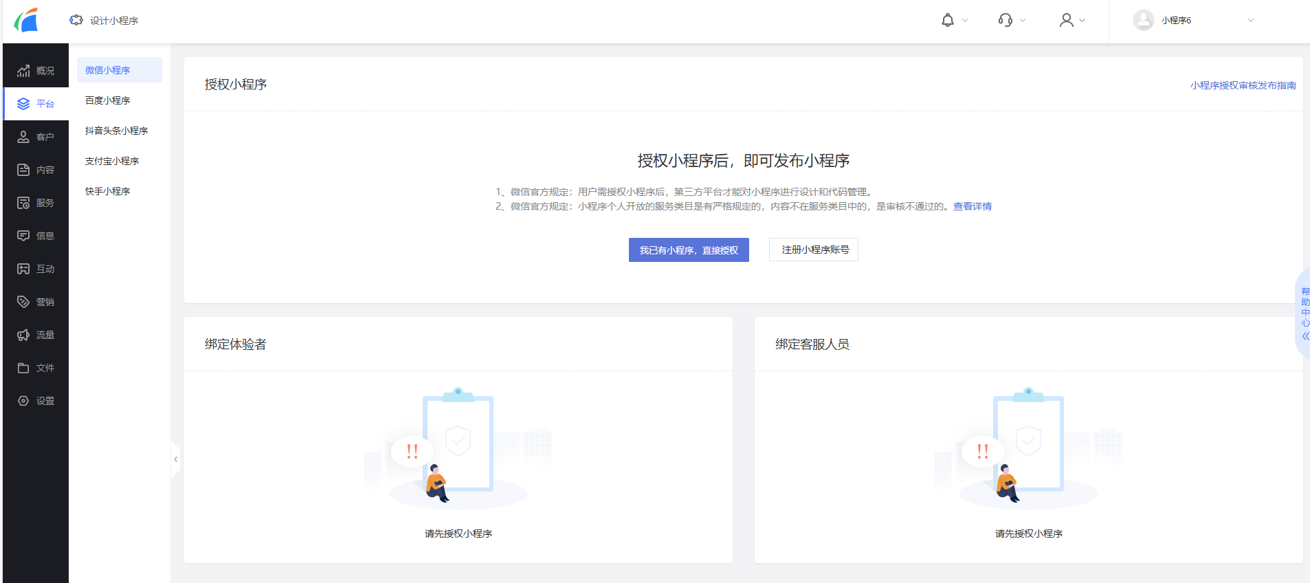 我們點擊“平臺”頁簽,就能看到“微信小程序”“百度小程序”“抖音頭條小程序”“支付寶小程序”“快手小程序”五個選項,我們選擇自己想要的小程序進行授權(quán)就行了。