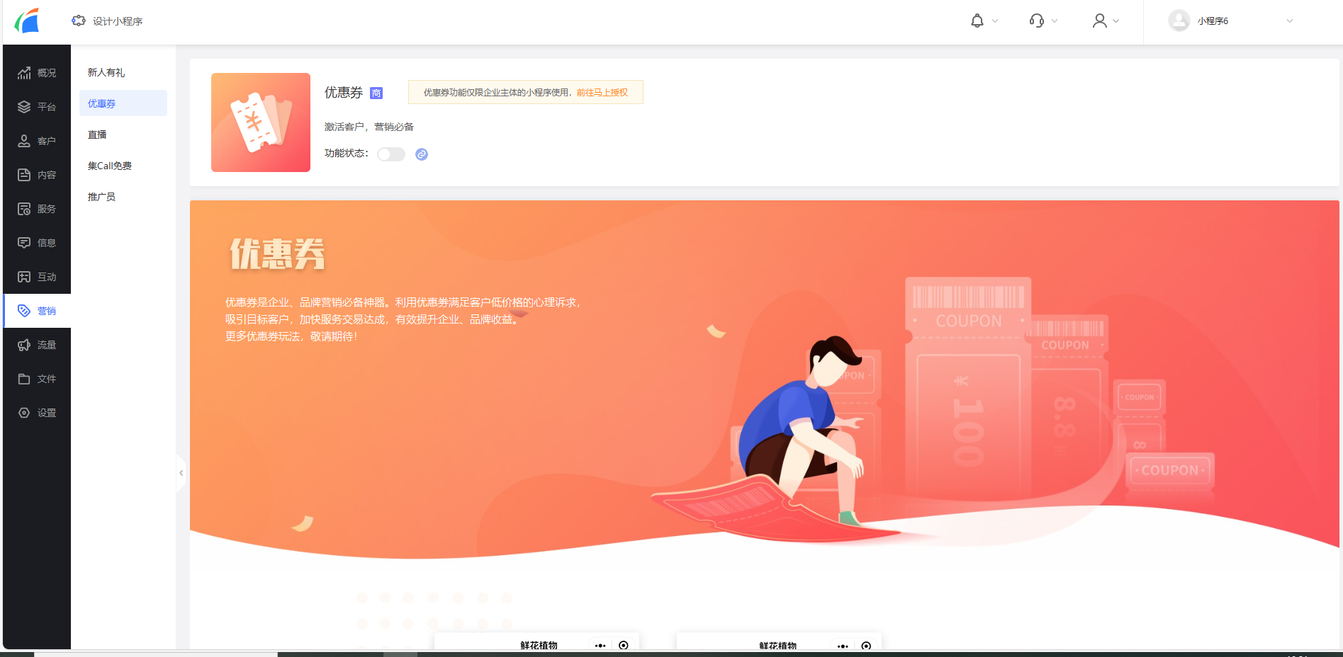 在管理后臺,我們點擊“營銷”頁簽,就可以看到新人有禮、優(yōu)惠券等營銷活動,大家自由開啟就行~