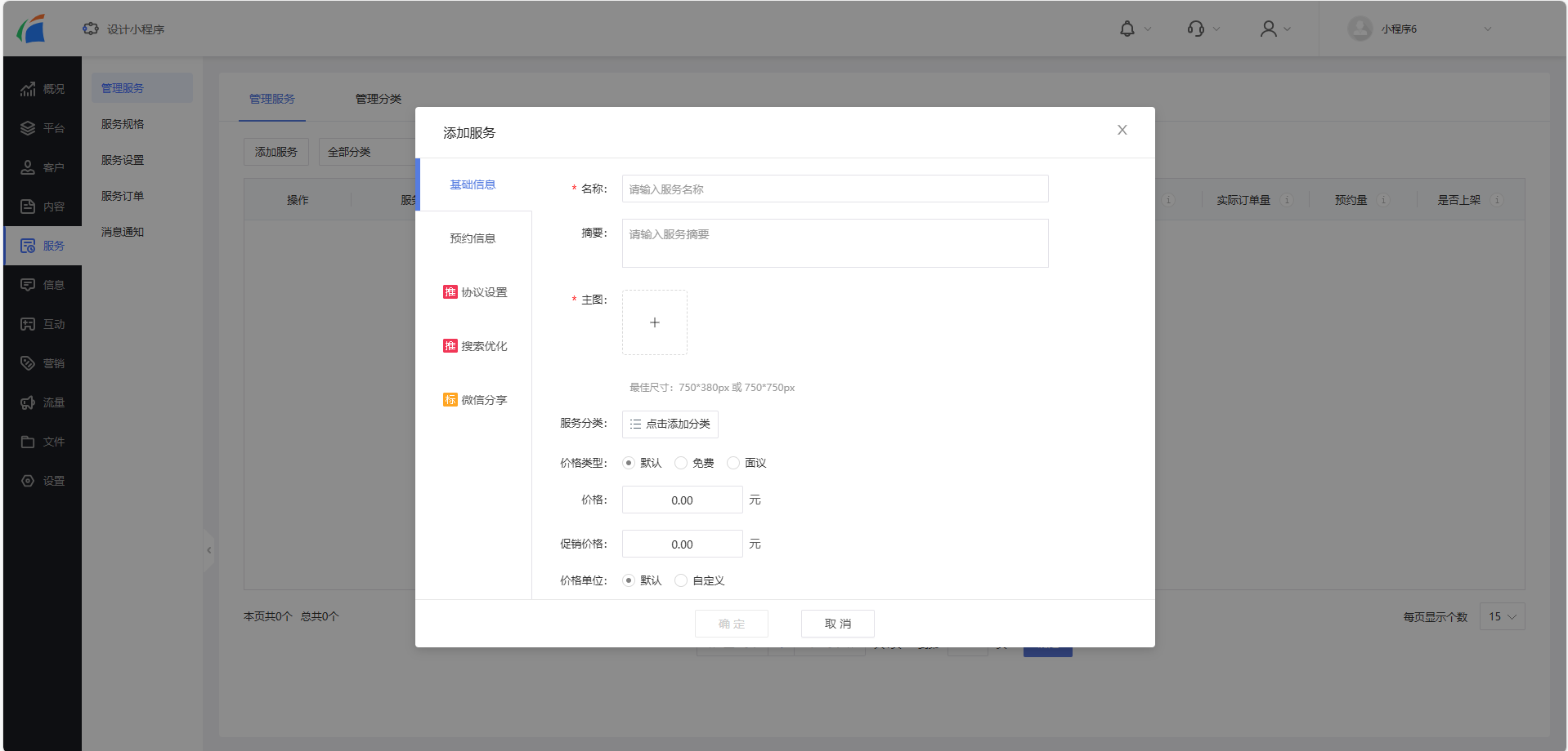 我們進入管理后臺,點擊“服務”-“管理服務”頁簽,進入管理服務詳情頁,然后點擊左上方的“添加服務”,輸入服務的基礎信息就可以啦!