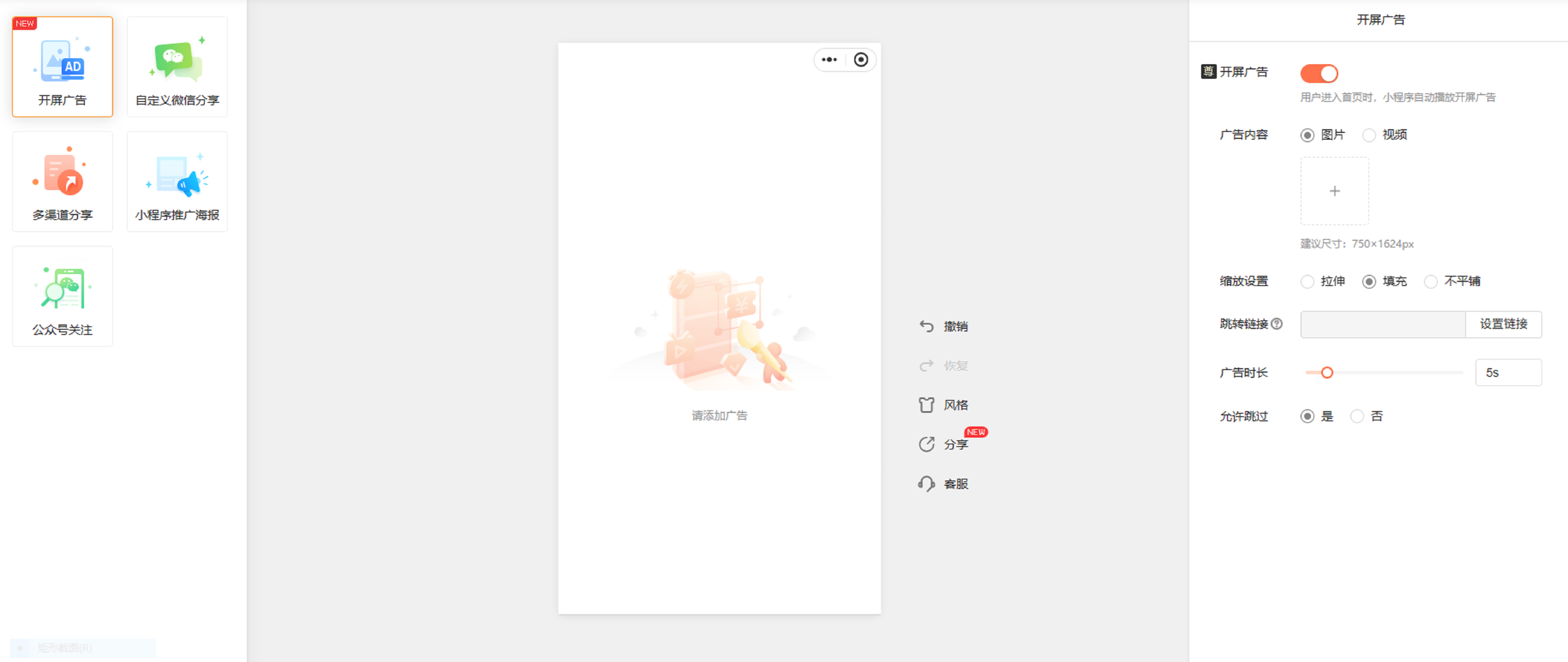 當(dāng)然,“推廣”欄目中的“開屏廣告”也是不錯的宣傳選擇。這樣當(dāng)顧客點(diǎn)開你家小程序,映入眼簾的便是這個營銷活動啦!