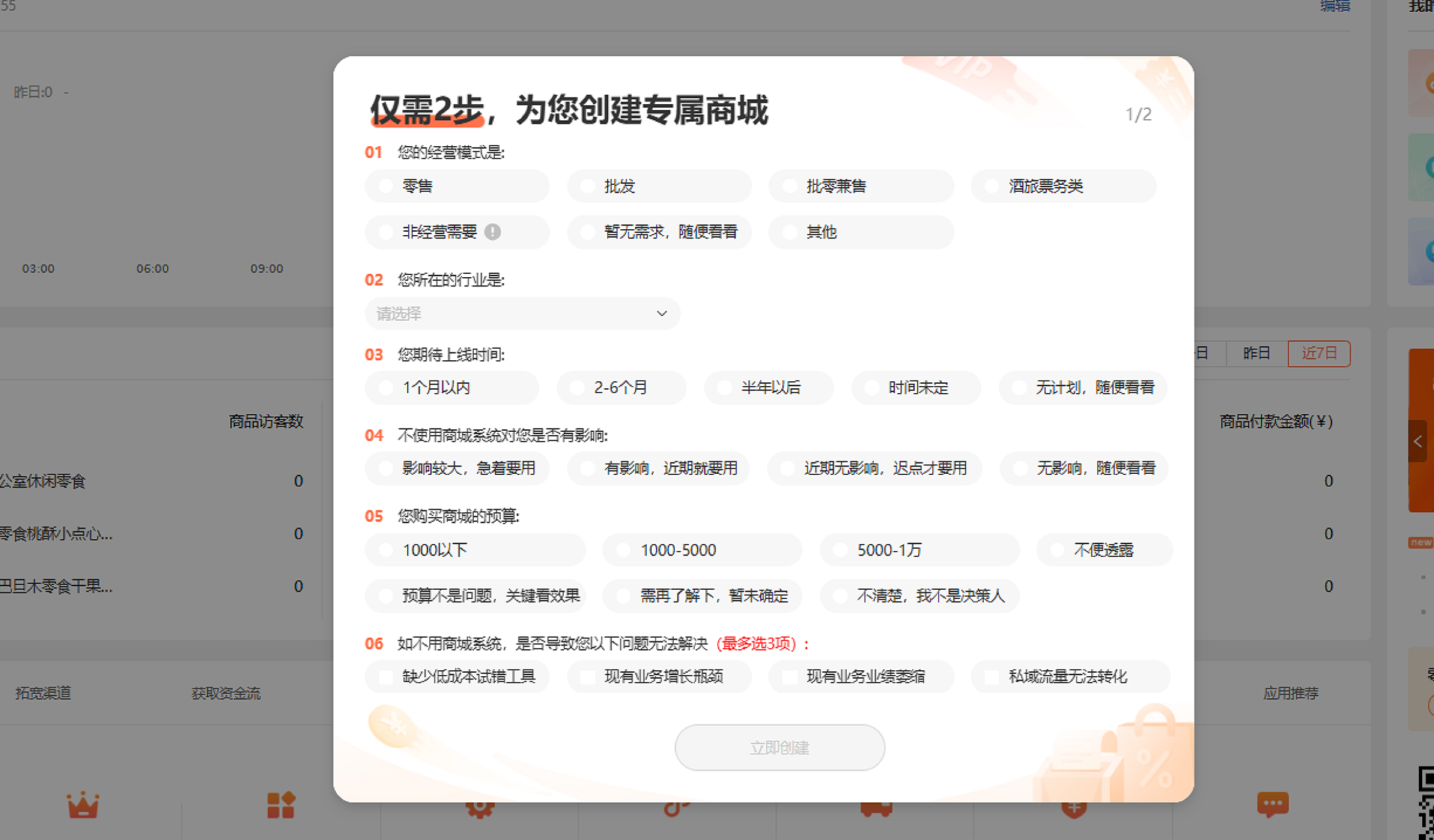 進(jìn)入首頁后,點(diǎn)擊“創(chuàng)建商城”,平臺會提供幾項(xiàng)選擇來讓你選擇。這是為了讓最終商城呈現(xiàn)出來的效果能夠符合大家們的預(yù)期。所以說,大家根據(jù)自家店鋪的實(shí)際需求來選擇就可以啦~