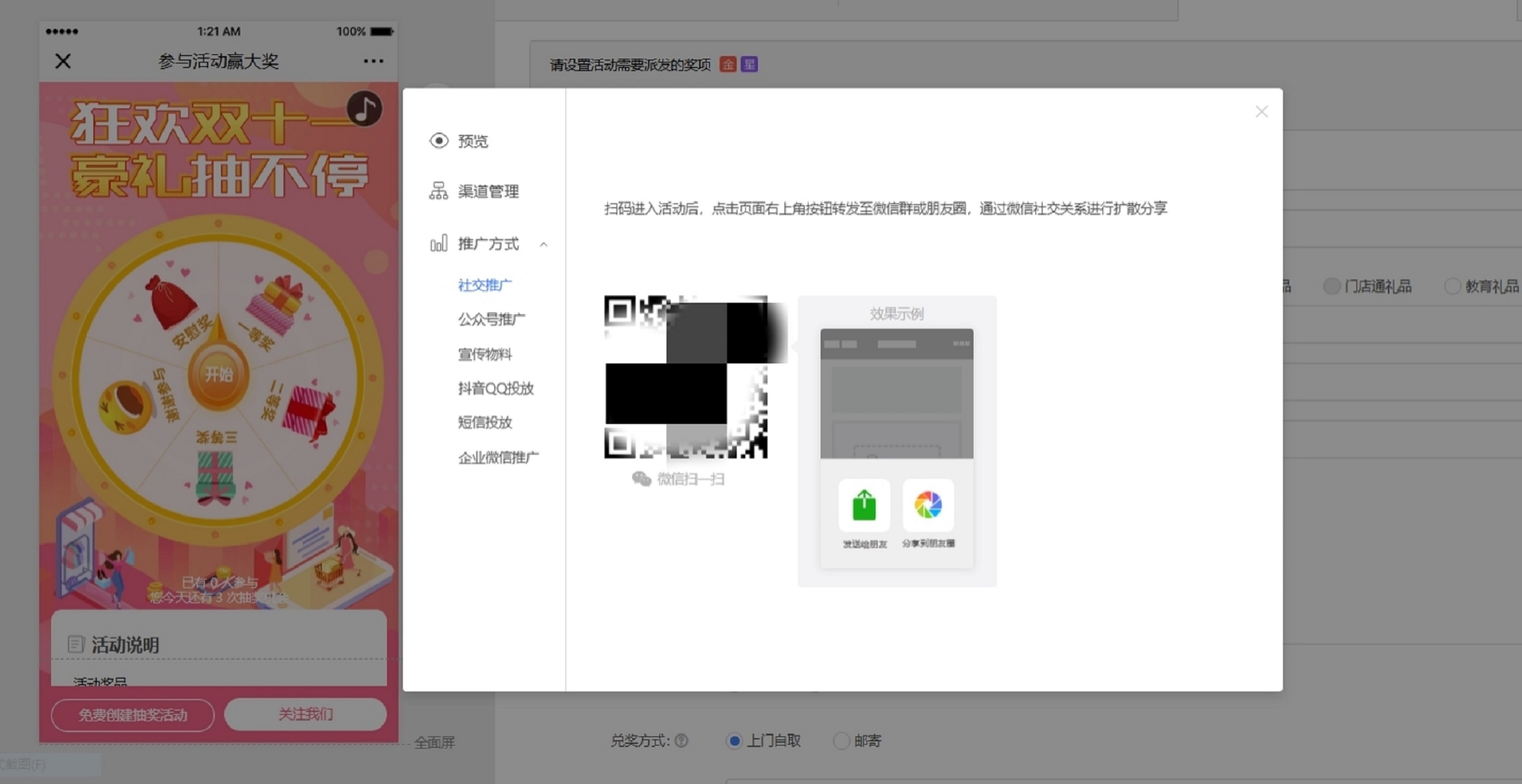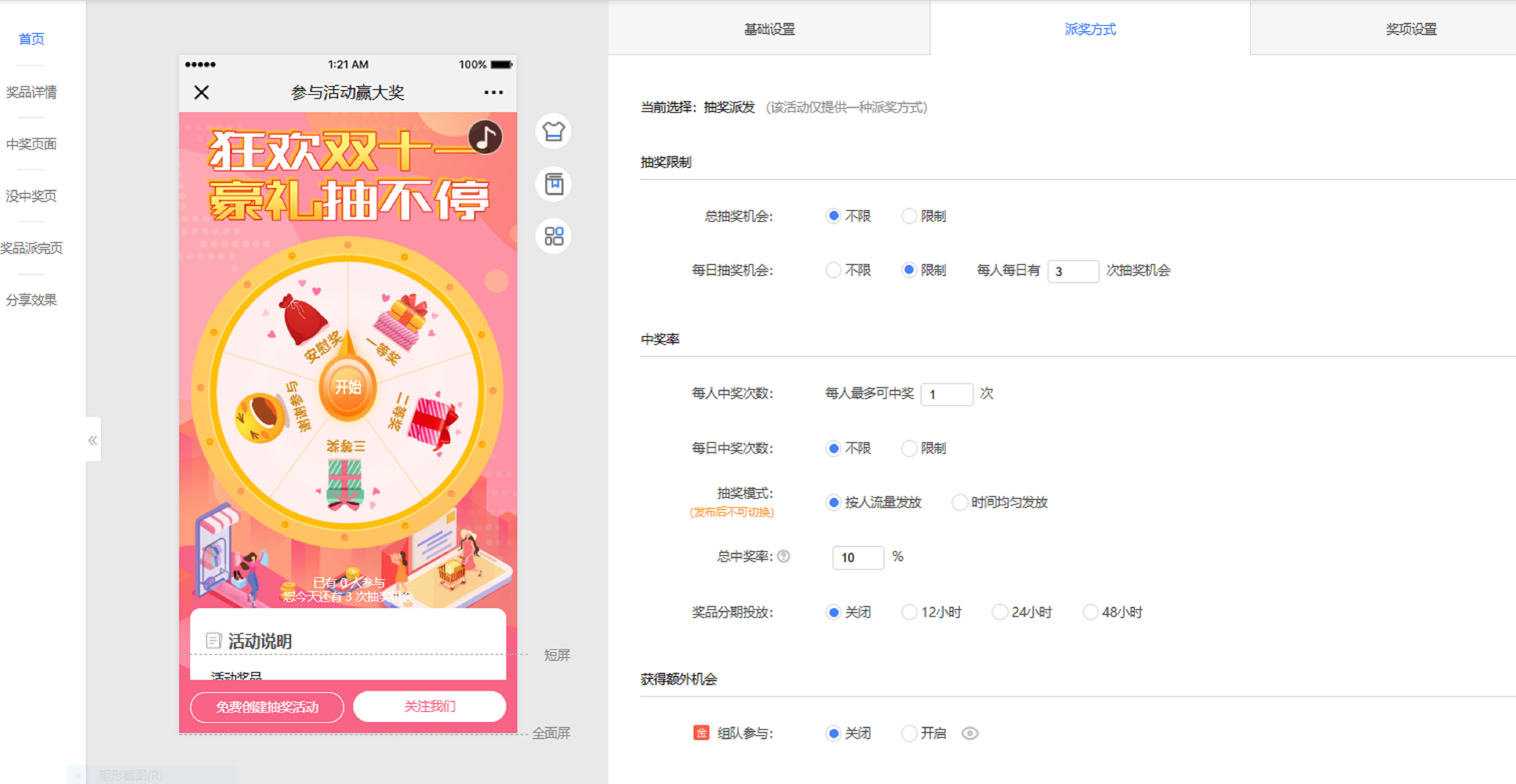 其次,在“派獎(jiǎng)方式”頁(yè)面上,咱們則需對(duì)本次活動(dòng)的中獎(jiǎng)率、抽獎(jiǎng)限制來(lái)進(jìn)行設(shè)置,以保證活動(dòng)的順利開(kāi)展。這一步十分關(guān)鍵,關(guān)乎到整場(chǎng)活動(dòng)的效果是好是壞!
