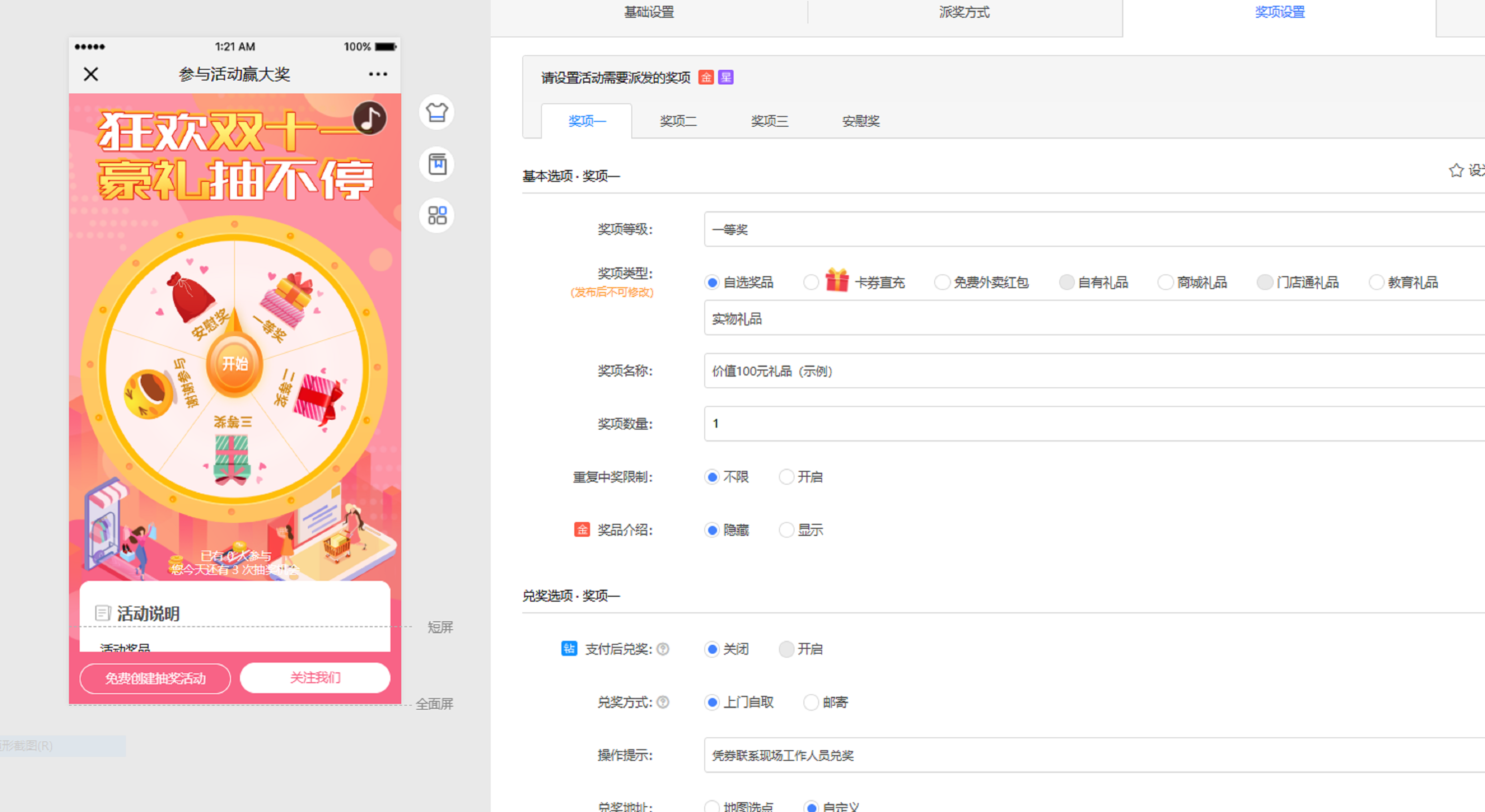 最后,在“獎(jiǎng)項(xiàng)設(shè)置”頁(yè)面上,我們可以對(duì)各個(gè)獎(jiǎng)項(xiàng)的等級(jí)、類型、名稱等內(nèi)心進(jìn)行一一設(shè)置歐~同時(shí),后續(xù)的兌獎(jiǎng)方式、地址等信息也能一并設(shè)置啦。