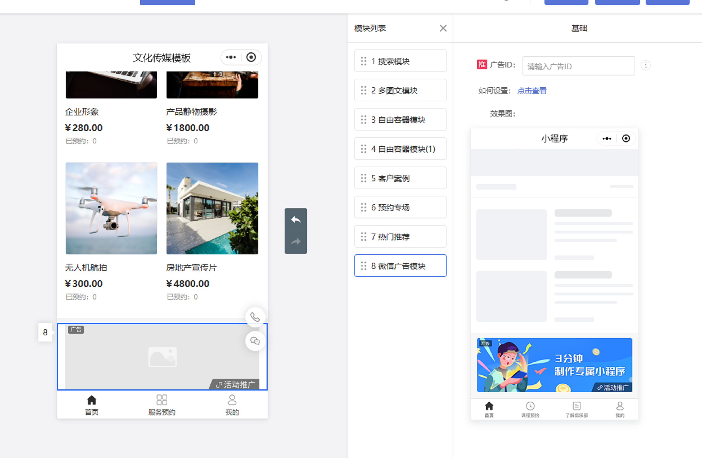 比方說(shuō),你想利用這個(gè)小程序?yàn)楣?店鋪近期舉辦的活動(dòng)打個(gè)小廣告,那么可以將“微信廣告”模塊添加上去。這樣廣告內(nèi)容便可以鮮明地呈現(xiàn)在小程序頁(yè)面上啦!