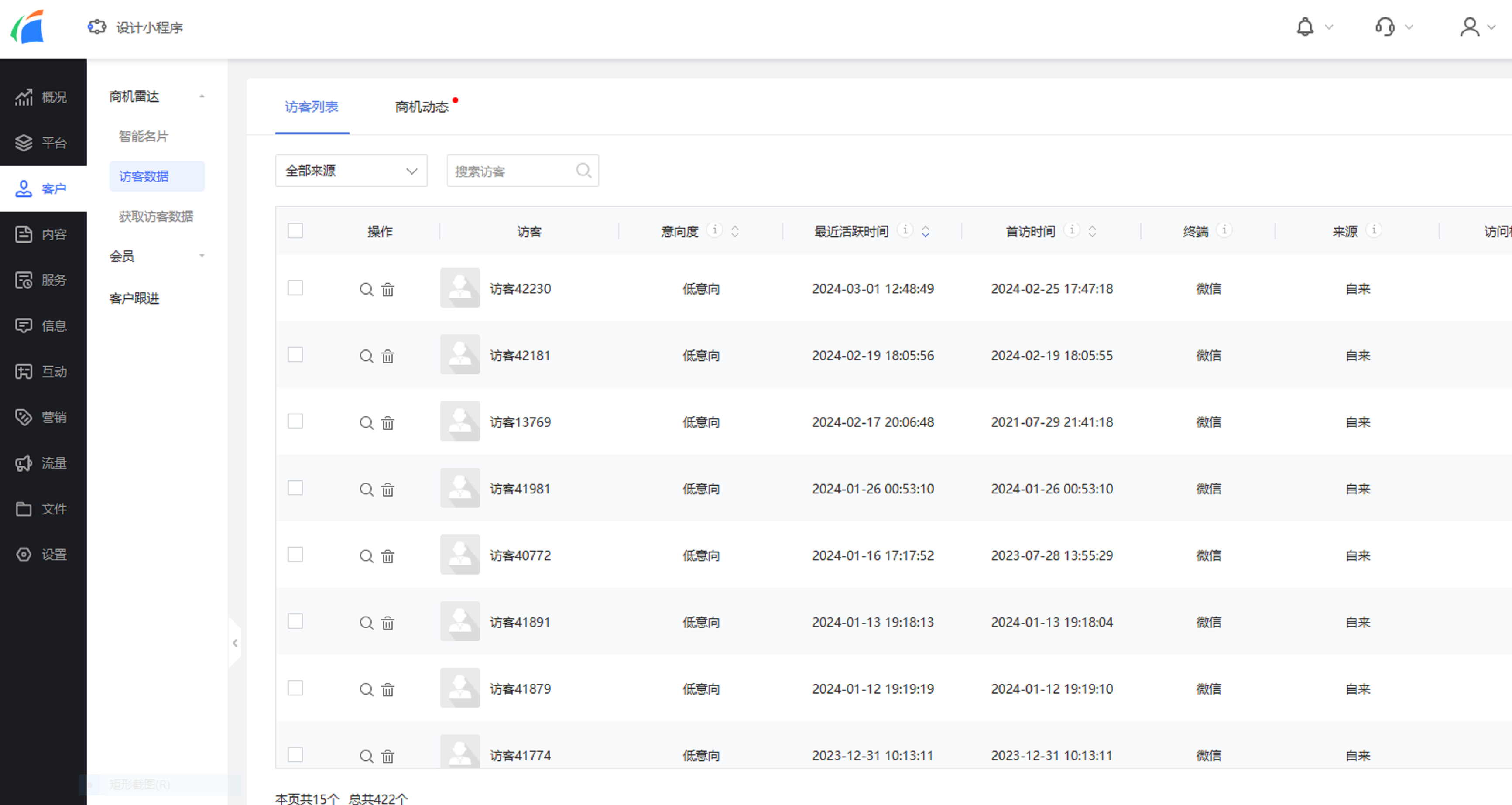 像是在“客戶(hù)”板塊,平臺(tái)會(huì)為各位直觀(guān)地呈現(xiàn)出每一位訪(fǎng)客他們的意向度、首訪(fǎng)時(shí)間、終端來(lái)源等信息。這些都有助于幫助我們?nèi)ゼ皶r(shí)調(diào)整營(yíng)銷(xiāo)策略。