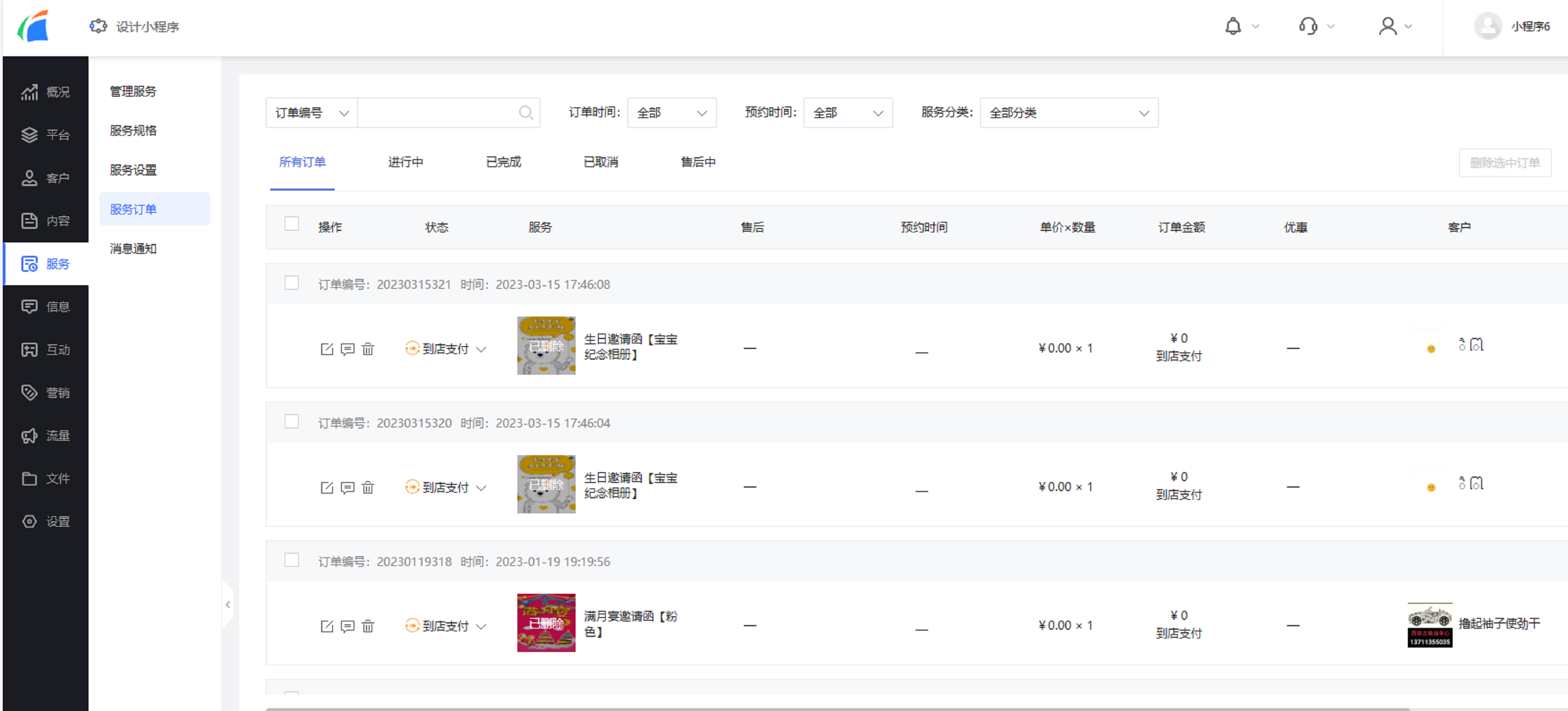 以及,針對(duì)各筆訂單的管理,我們也可以在后臺(tái)實(shí)現(xiàn)。在“服務(wù)”板塊中,大家可以看到每筆服務(wù)訂單的詳細(xì)信息,以便于后續(xù)對(duì)其進(jìn)行管理與分析。