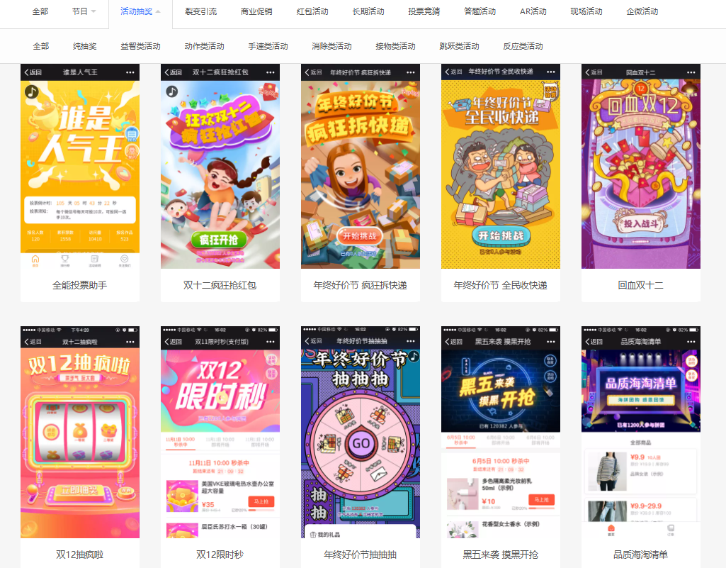 首先,在平臺的模板中心里,我們搜索“雙十二”后,平臺會為各位呈現(xiàn)出許多雙十二主題的營銷活動模板。