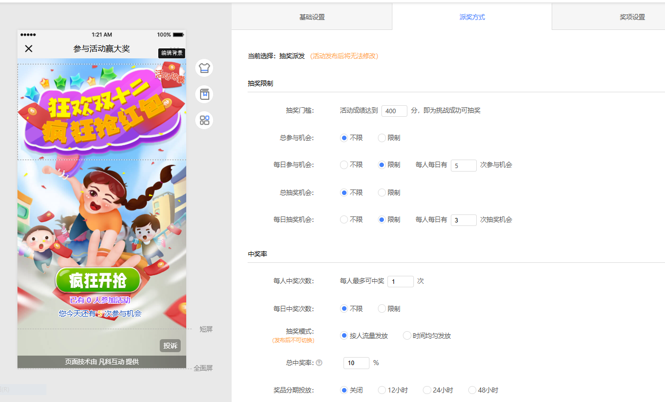 然后呢,在“派獎方式”頁面上,則是可以對本次活動的門檻、參與機會、中獎率等關鍵性的內(nèi)容進行設置,以保證活動能夠順利開展下去。