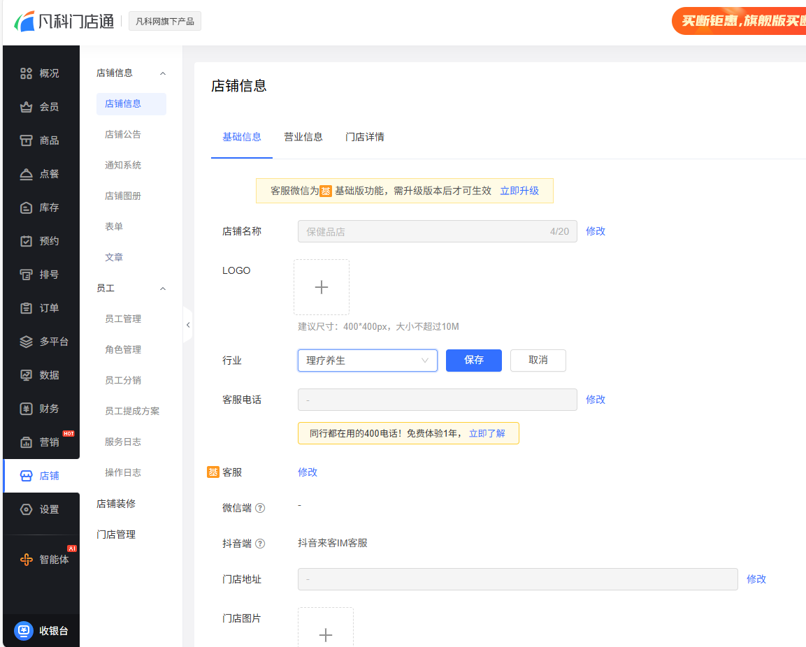 我們要用到的是【凡科門店通】這個工具。我們打開這個工具,注冊賬號,完善保健品店的信息。在這里,你可以上傳實體店的照片,定位門店地址,上傳門店logo,這樣有助于提高門店的真實性,從而吸引顧客下單購買。