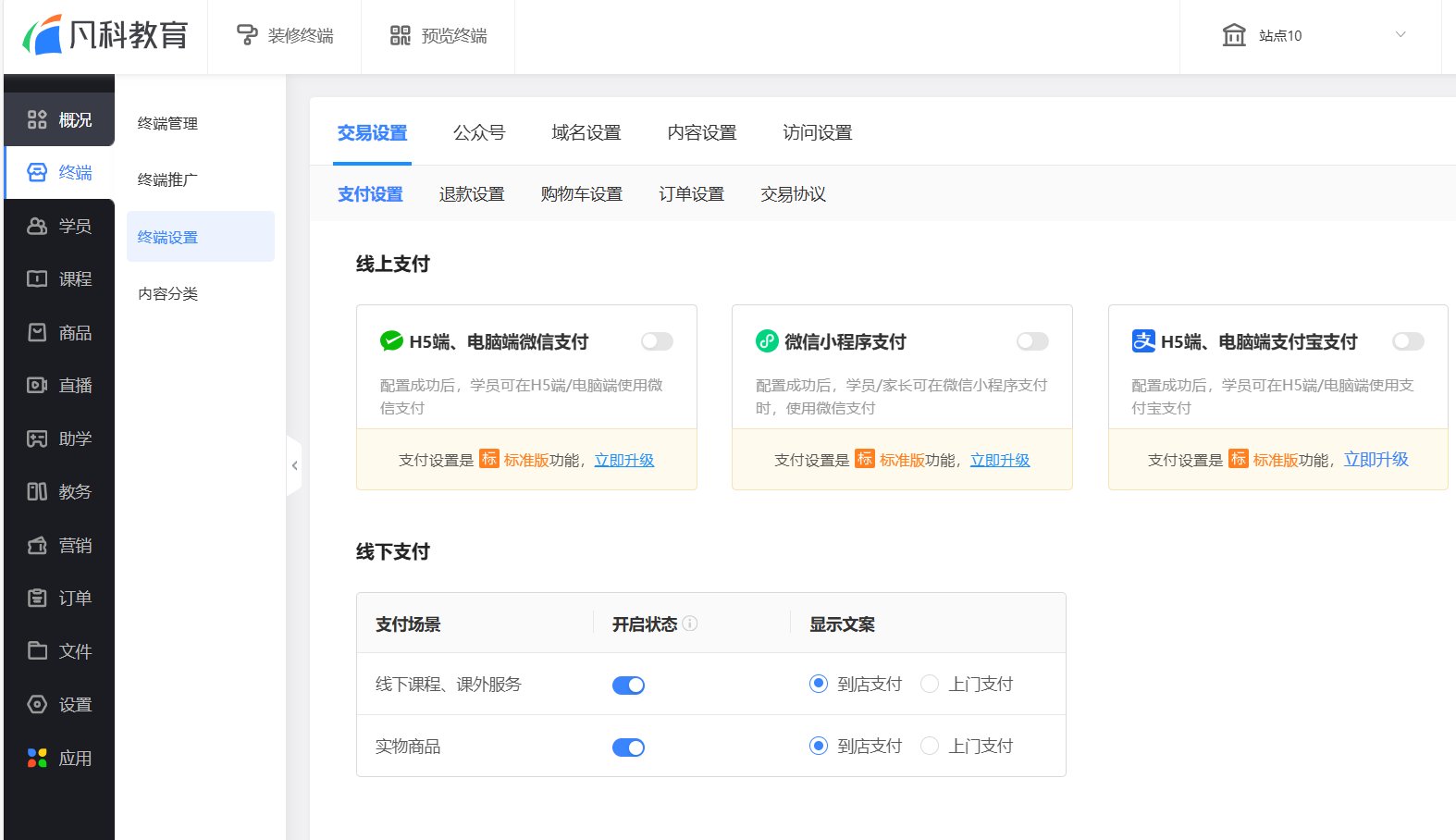 我們先進入平臺,注冊賬號,然后點擊“終端”-“終端設(shè)置”。我們來到“交易設(shè)置”-“支付設(shè)置”頁面,開啟線上支付就可以了。這里有H5端、電腦端微信支付和微信小程序支付兩種微信支付方式,大家可以根據(jù)需求自由選擇哦~
