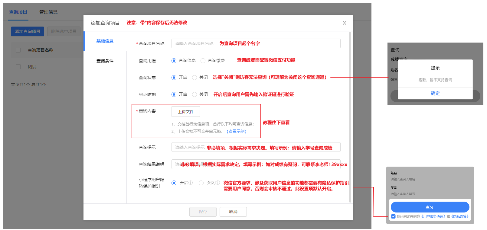 在這里,我們可以選擇查詢用途為“查詢繳費”,輸入查詢項目名稱、查詢條件、查詢內(nèi)容,選擇查詢狀態(tài)、驗證防刷等信息,就可以成功添加查詢繳費項目啦!